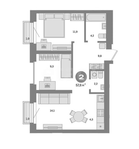 Купить 2х комнатную квартиру, 57.8 м²