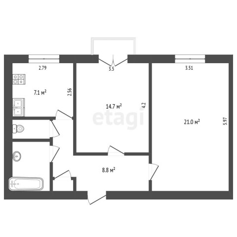 Купить 2х комнатную квартиру, 57.3 м²