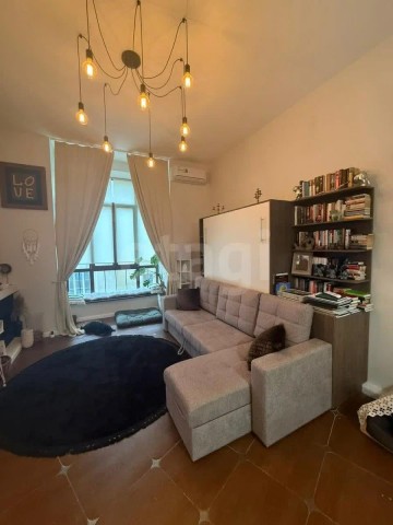 Квартира находится на втором этаже десятиэтажного здания. Общая площадь — 40,5 м², жилая — 27,3 м² с кухней в 6 м². Высота потолков достигает 4 метров, а окно выходит на спокойный переулок. Продается с мебелью: присутствуют шкафы, антресоль, диван-кровать, обеденный стол. В квартире установлены все необходимые бытовые приборы: посудомоечная и стиральная машины, микроволновка, холодильник, варочная панель, духовой шкаф и кондиционер. Полгода назад был выполнен косметический ремонт.