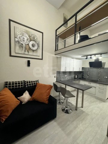 С высотой потолков 4,3 метра, она предлагает 19 квадратных метров жилой площади по полу и дополнительные 13 квадратов на антресоли.